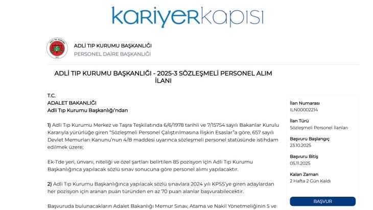 kariyerkapisi.gov.tr/isealim adresinden 20/10/2025 – 03/11/2025 tarihleri arasında alınacaktır.